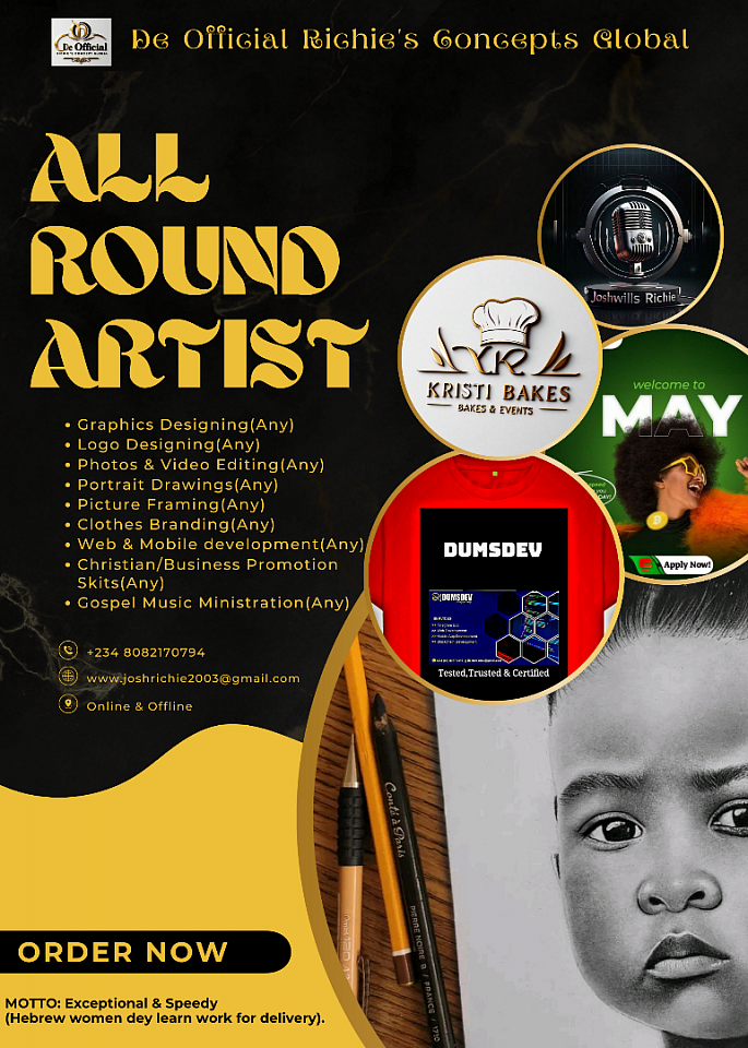 We are De Official Richie's Concepts Global Company Nigeria, and we are out to provide & satisfy you with our all round tech, visual, social and art related services e.g; Portrait drawings & picture framing, clothes branding, graphics designing, Tech developments (Apps and web developments), music vocal & dance ministration (Gospel), stage or set drama ministration (Gospel), photography, videography, photos & videos editing and business or any promotions skits and contents, finally our special POS services etc.
